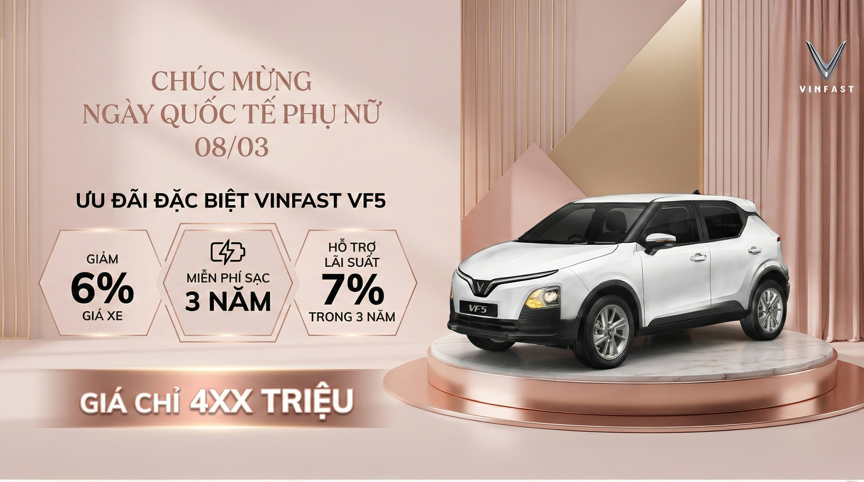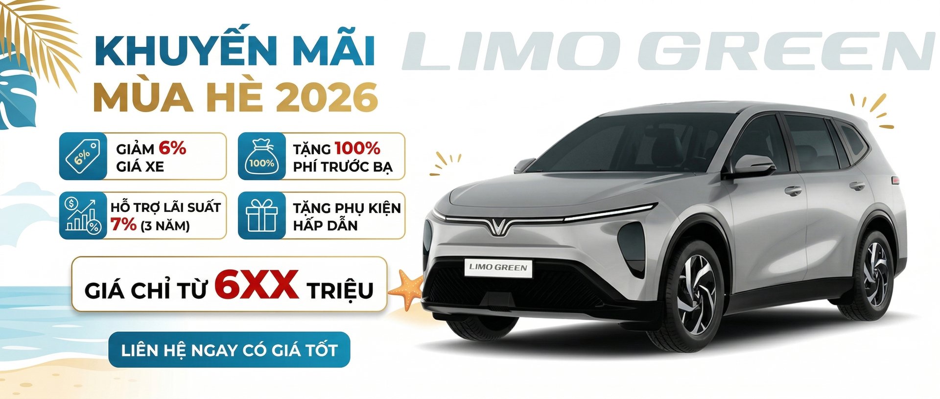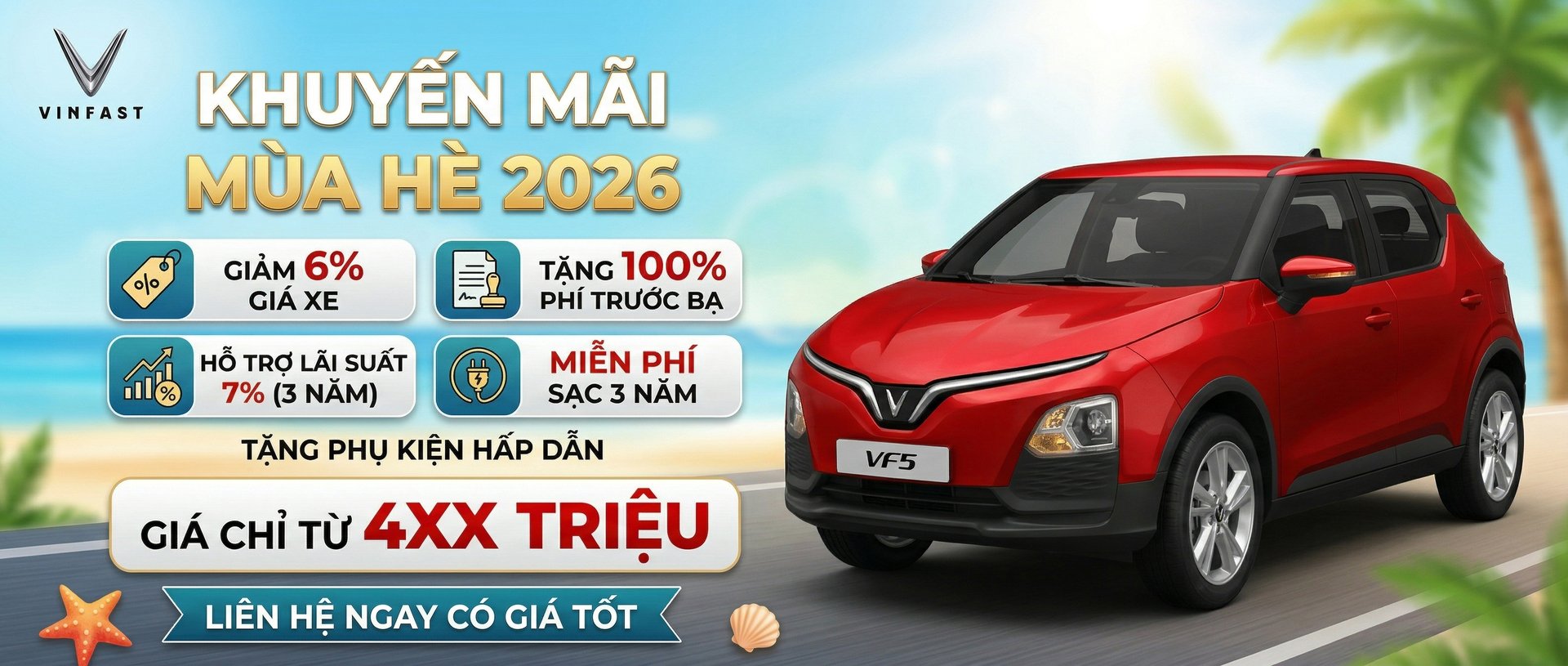 - VINFAST VF5 (Gồm Pin): Giá niêm yết 497 triệu - Ưu đãi ngay trước bạ 0 đồng, Giảm 6% Giá Xe, Tặng 2 Năm Bảo Hiểm Thân Vỏ, Giảm Lãi suất 7% trong 3 năm - Gửi xe miễn phí (dưới 5 tiếng) và ưu tiên đỗ tại mọi địa điểm thuộc hệ sinh thái Vingroup - Sạc pin miễn phí tại các trạm sạc tới hết 10/02/2019 - Hỗ trợ trả góp lên tới 80% giá trị xe, lãi suất ưu đãi - Liên hệ trực tiếp để có GIÁ ƯU ĐÃI TỐT NHẤT