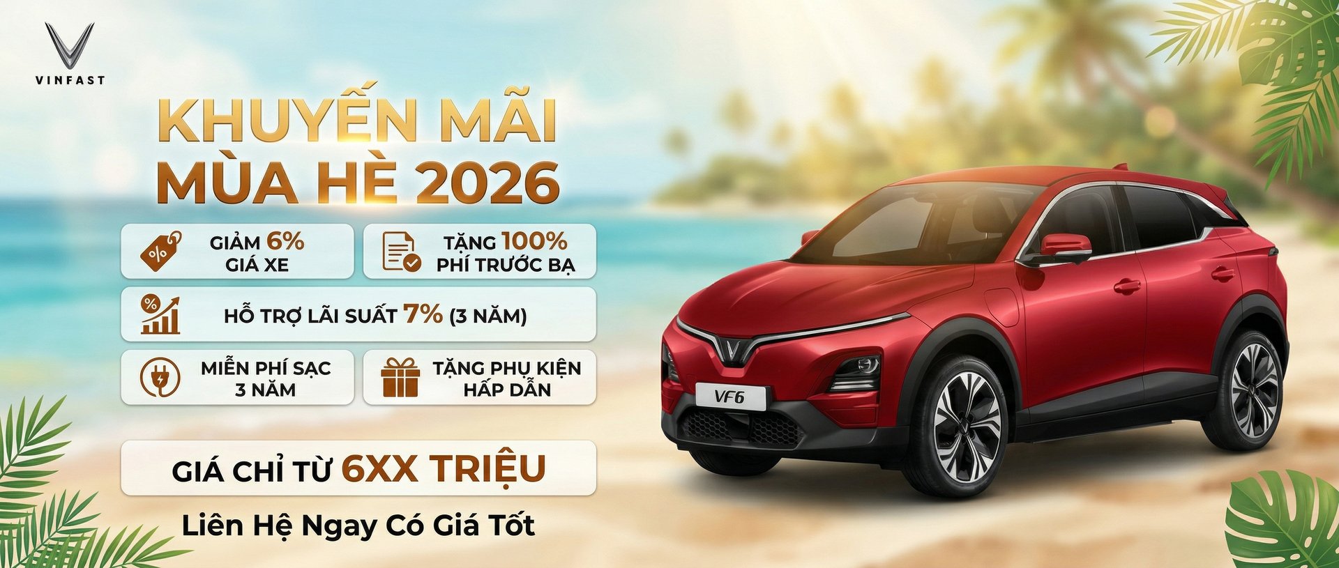 - VINFAST VF6 (Gồm Pin): Giá niêm yết chỉ từ 647 triệu - Ưu đãi ngay trước bạ 0 đồng, Giảm 6% Giá Xe, Tặng 1 Năm Bảo Hiểm Thân Vỏ, Giảm Lãi suất 7% trong 3 năm - Gửi xe miễn phí (dưới 5 tiếng) và ưu tiên đỗ tại mọi địa điểm thuộc hệ sinh thái Vingroup - Sạc pin miễn phí tại các trạm sạc tới hết 10/02/2019 - Hỗ trợ trả góp lên tới 80% giá trị xe, lãi suất ưu đãi - Liên hệ trực tiếp để có GIÁ ƯU ĐÃI TỐT NHẤT